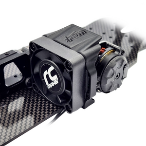 With our fan shroud, there is no need to purchase any after market fan mounts. The fan shroud screws directly to the motor-mount and floats the fan and shroud assembly off the chassis for uninterrupted flex. The assembly is also adjustable in/out and up/down in by adding or removing shims from the screw, and sliding in the slot. This can be handy for balancing your car or adjusting height to clear weight underneath!