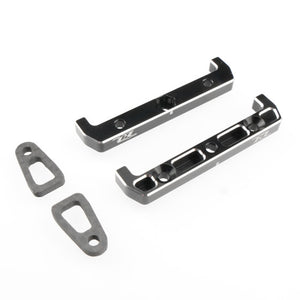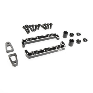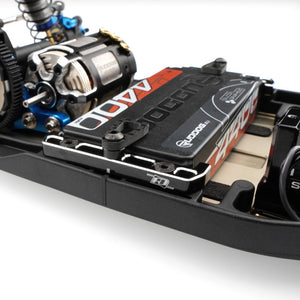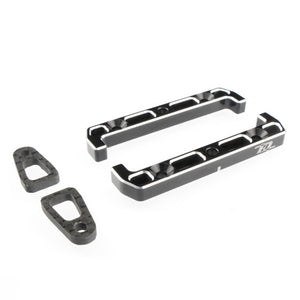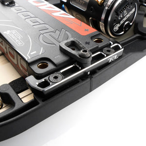 The Revolution Design Racing Products (RDRP) B7 Ultra Battery Mount Set (RDRP0648) is a direct replacement for the standard plastic battery mount. Not only does the Aluminum Battery Mount Set look great with its black anodized aluminum and silver beveled edges, it is also a sturdier version and will hold your battery securely in place. Additionally, the combination of aluminum and carbon fiber parts gives your Team Associated RC10B7 and RC10B7D buggy a professional look and is designed to accommodate shorty batteries of all capacities and sizes. The set includes three different heights of washers and screw lengths to adjust the mount to the battery height and can be operated without tools.