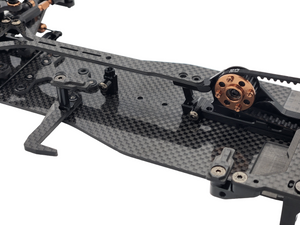 Battery installation is an important part of the car, being such a heavy component. The SP1 features the easily twistable tabs for quick changing of batteries. The kit includes carbon battery hooks, which can slide in and out for different battery widths. The battery fwd/back movement can also be tuned by the eccentric battery posts. Simply loosen and twist the post into different spots to tune the position or movement of the battery.