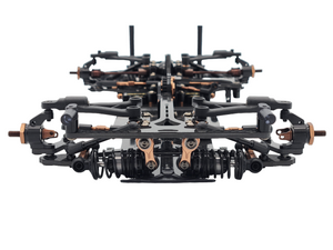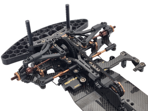 The short chassis reduces scrubbing, and also centralises the weight of all suspension components to reduce the moment of inertia. The suspension arms all taper in a way that allows the chassis to be short, while maintaining a normal wheelbase. This moves all screws, ball studs and cups towards the centre of the car. This makes the car more nimble, allowing it to change direction fast and rotate quickly in the corner for maximum corner speed. The chassis is also very narrow at only 82mm, and the profile minimised for reduced scrubbing in corners.