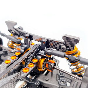 As well as this, they prevent the body rolling onto the outside tire in cornering. Wheel arch rubbing is not good for your body, tires or corner speed! Our Front Body Stabilizer helps prevent the bodyshell rolling during cornering, by supporting it widely over the wheel arches.