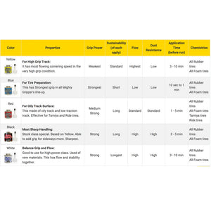 So now, You may have a best traction compound for high grip track and its yellow. Then you may also have a best traction compound for low grip track.