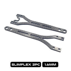 We have optimised the profile of our SlimFlex topdecks such that the flex point is shifted forward, whilst still being adjustable so that you can optimise the flex for your track. This is particularly important on high traction tracks, where drivers want to reduce the flex on the front of the chassis to make the car easier to drive carrying more corner speed. This is in stark contrast to a low traction asphalt setting which would require a significantly more forward biased flex point. Our topdecks allow the ability to adjust this both by motor-mount pivot screws, and central flex tabs. The flex tabs can be cut one by one, to achieve the desired amount of flex, both front and rear.