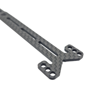 The 1 Piece topdeck offers an array of flex options, including screw position and carbon tabs. A very popular choice by many teams at the top level in 2025. It also features an additional hole in the slot to install the most rearward motormount screw. This must be installed with a 0.5mm shim between the motormount and the topdeck.